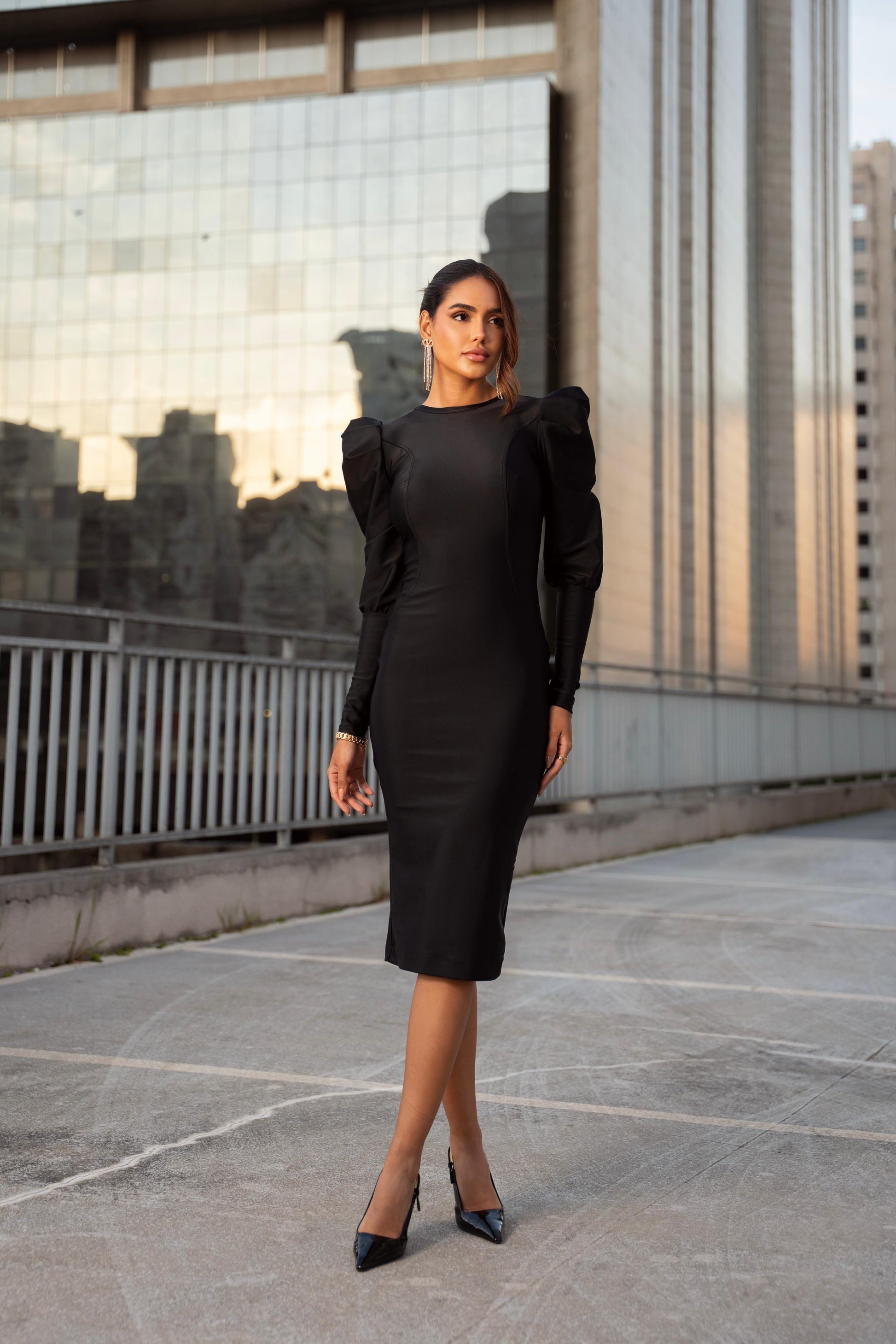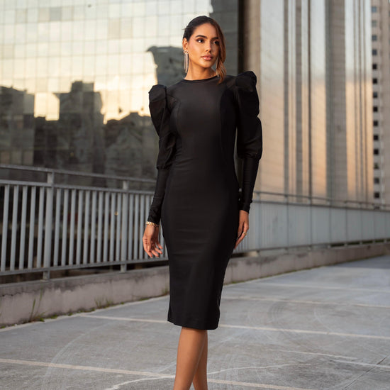 The Aurora Dress is the perfect choice for those seeking elegance, delicacy, and a touch of romance. With a midi length that elongates the silhouette and long princess-style sleeves, the design offers just the right amount of sophistication. Its delicately rounded open back subtly enhances the back, evoking a timeless, classic feel. The puffed sleeves with fitted cuffs add vintage charm, while the cinched waist gently accentuates feminine curves.