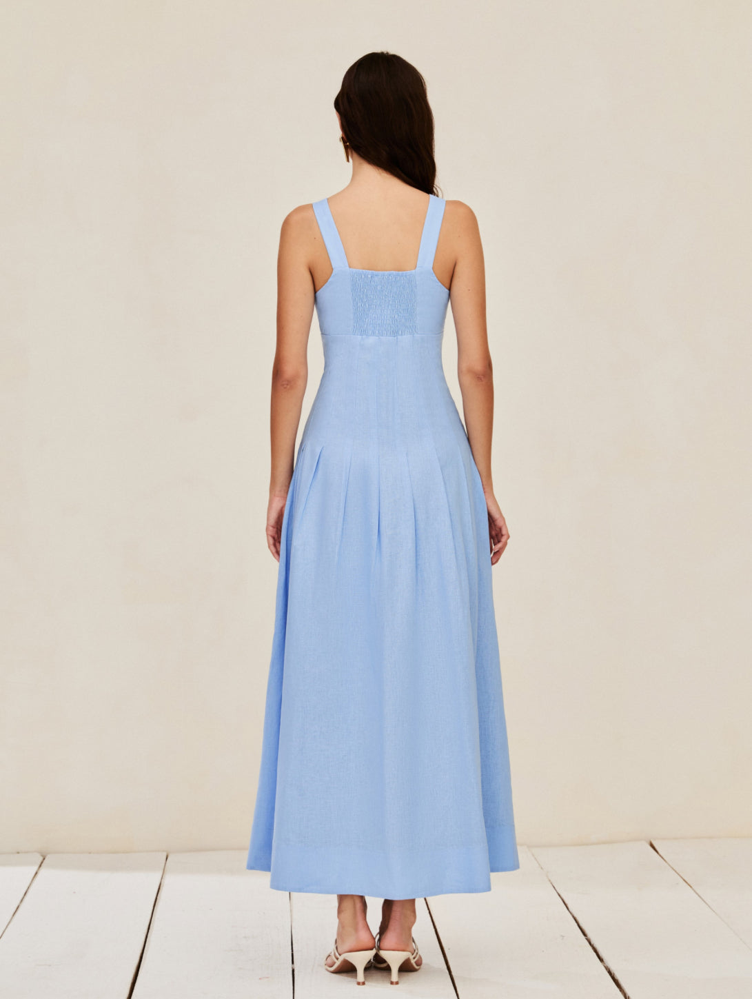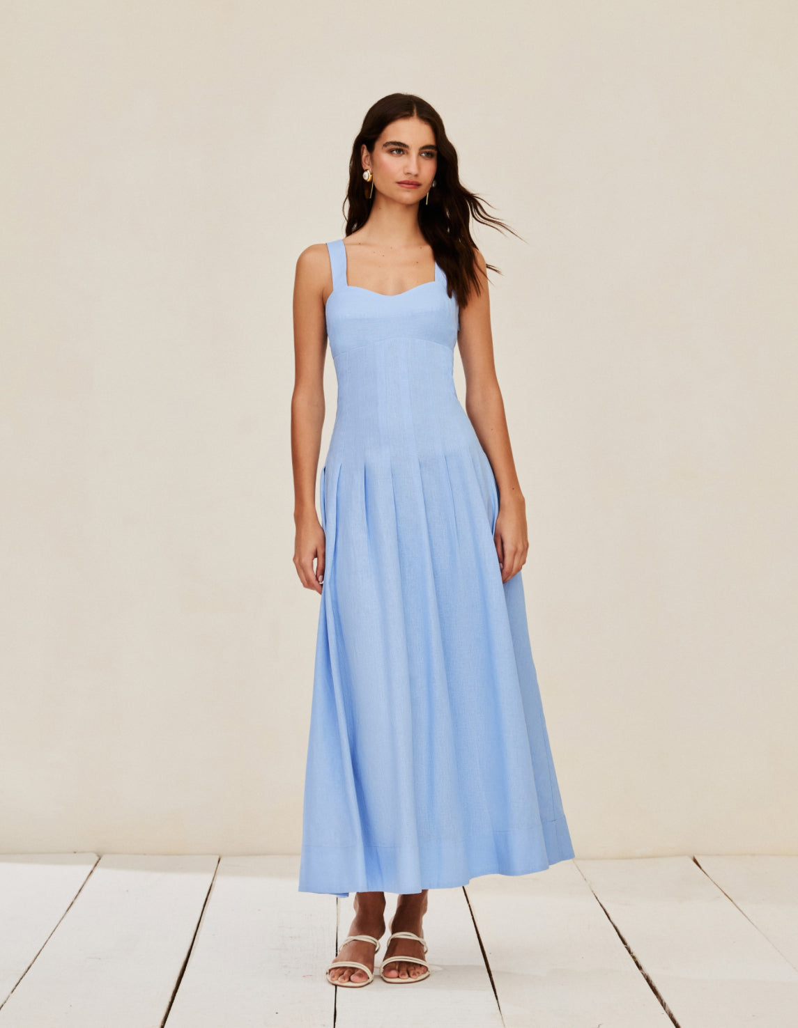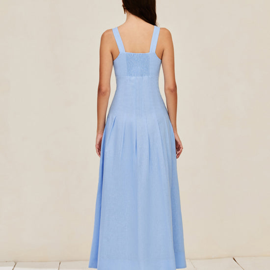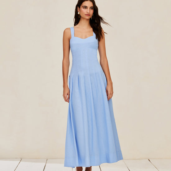 Linen blend dress with wide straps, structured bust, pleated waist, and a full skirt. It features a flared hem, elastic back, side zipper closure, and lining.