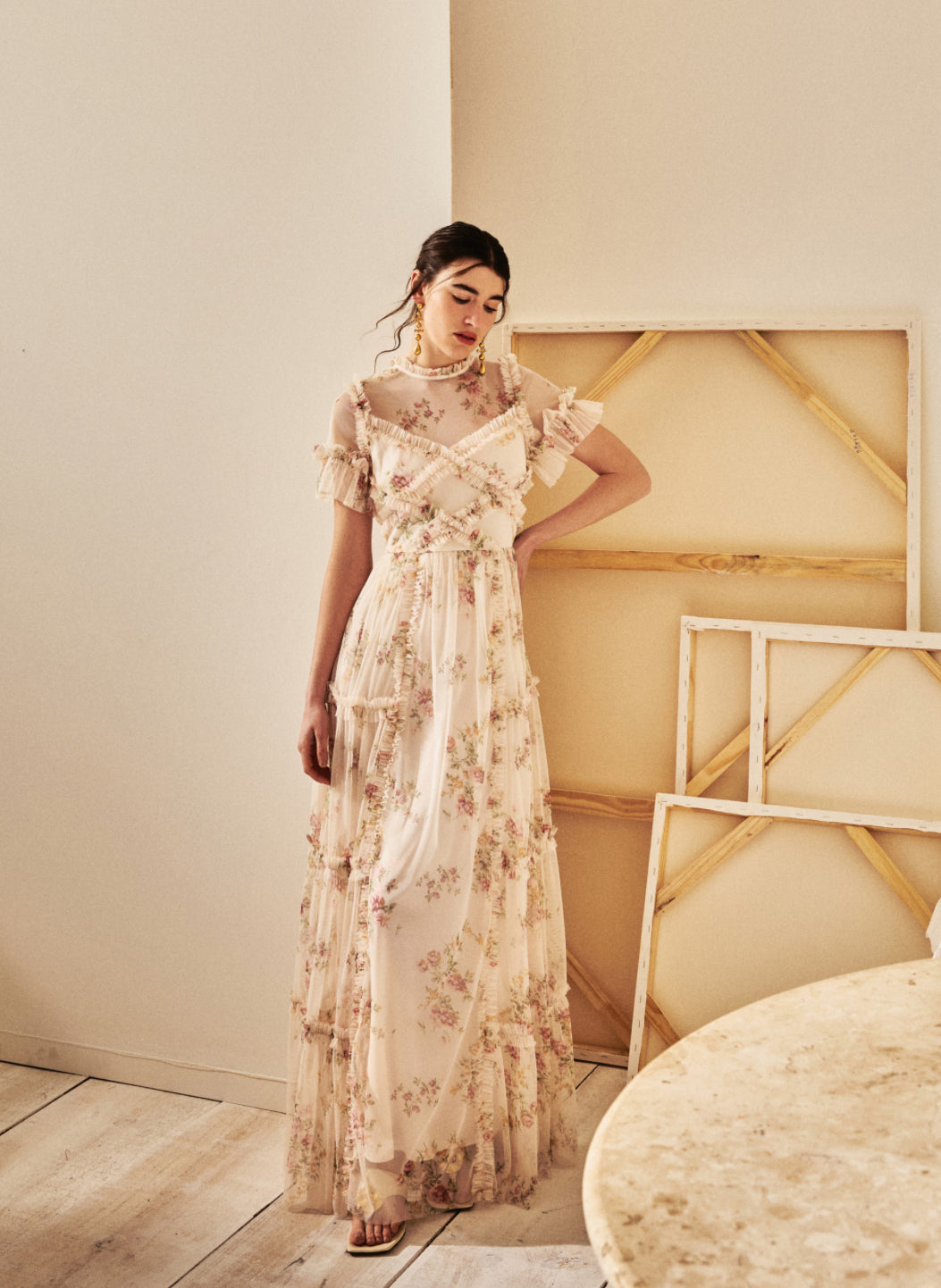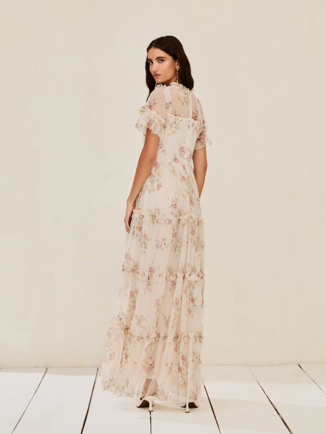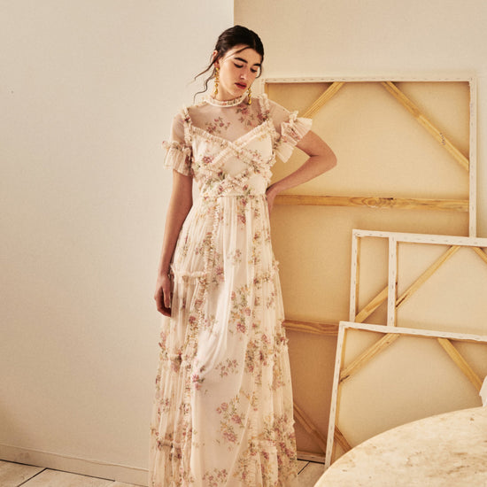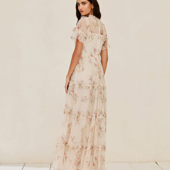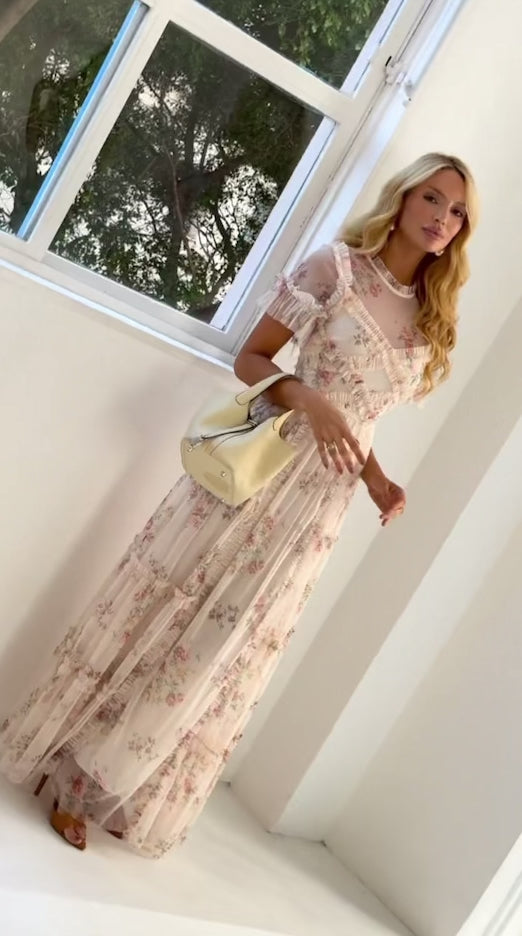 Tulle dress with an exclusive floral print, short sleeves with ruffled detailing, ruffles at the collar, wrap-around bust, and layered skirt.