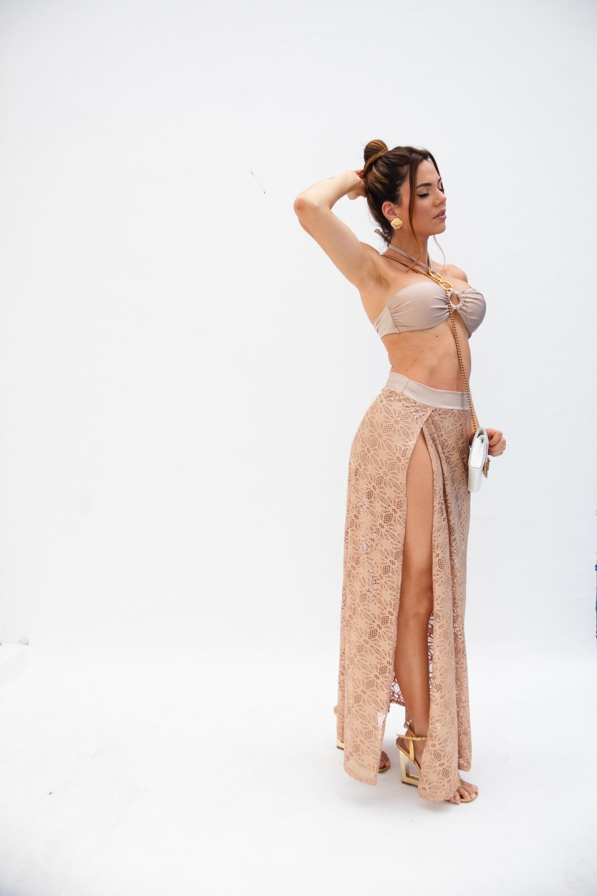 Effortlessly chic and beach-ready, the Sunlit Lace Skirt adds a touch of delicate elegance to your swimwear look. Made from soft nude crochet lace with a floral pattern, this high-waisted skirt features a flirty side slit that reveals just enough skin while keeping it breezy and stylish. Perfect for layering over your bikini or one-piece when transitioning from beach to brunch.
