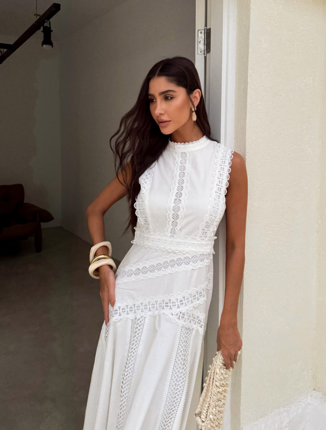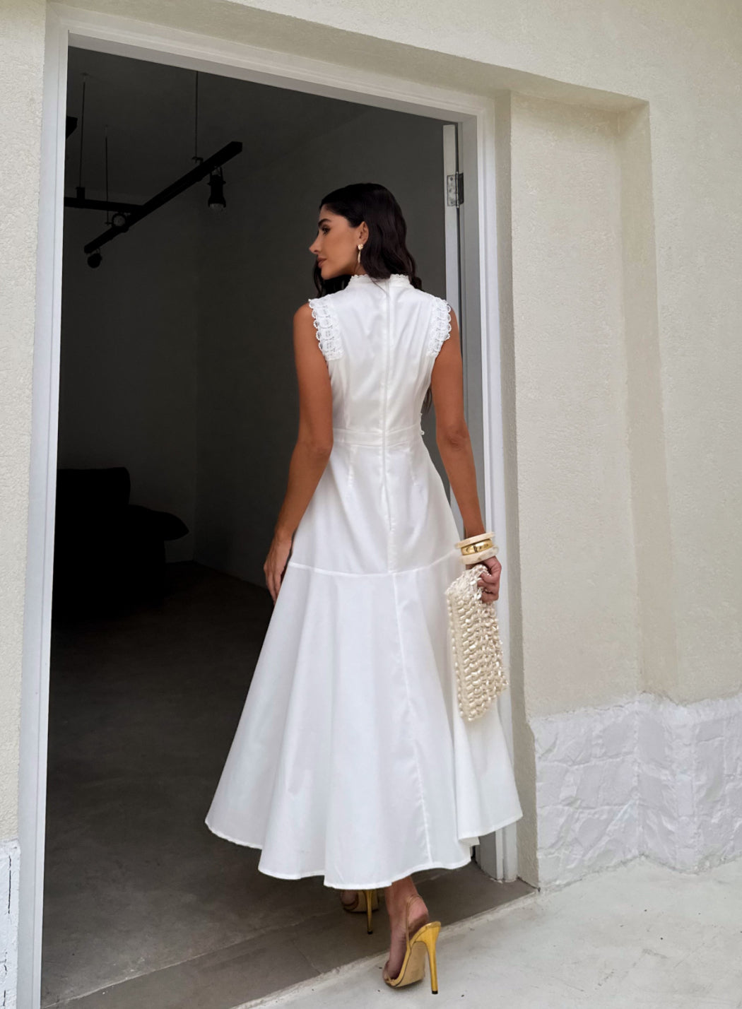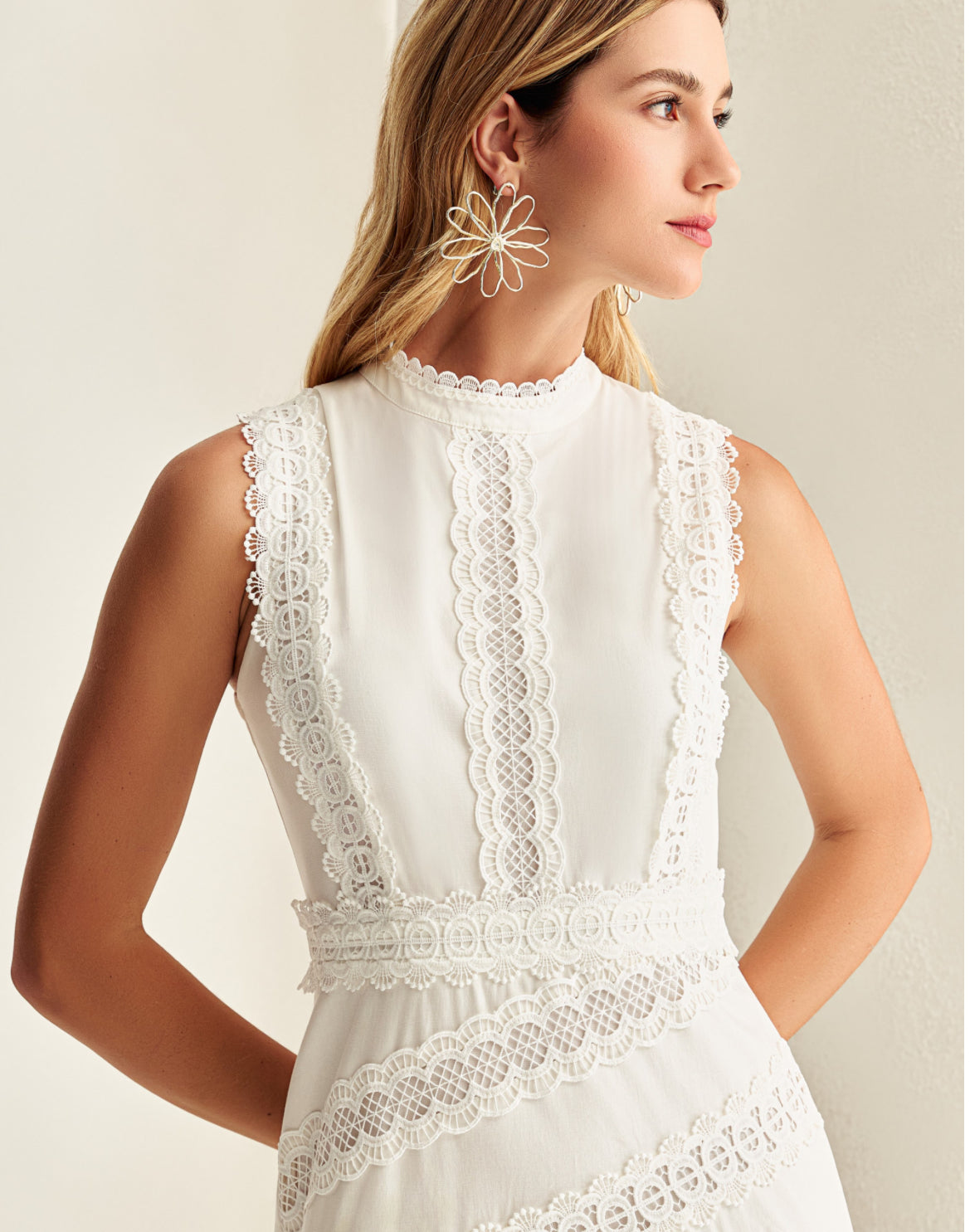 Tricoline dress with various guipure lace appliqués on the bodice, waist, and skirt. It features a back zipper closure and lining.