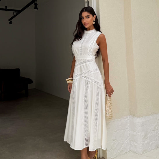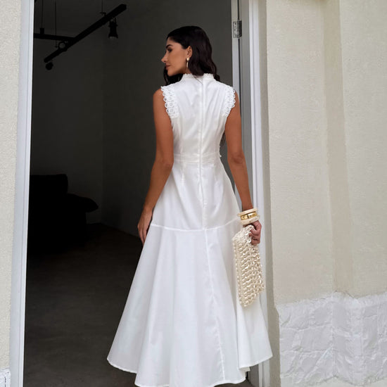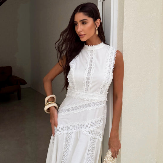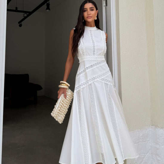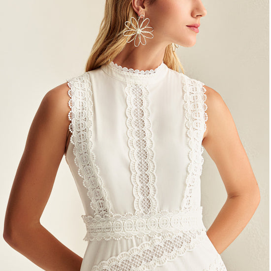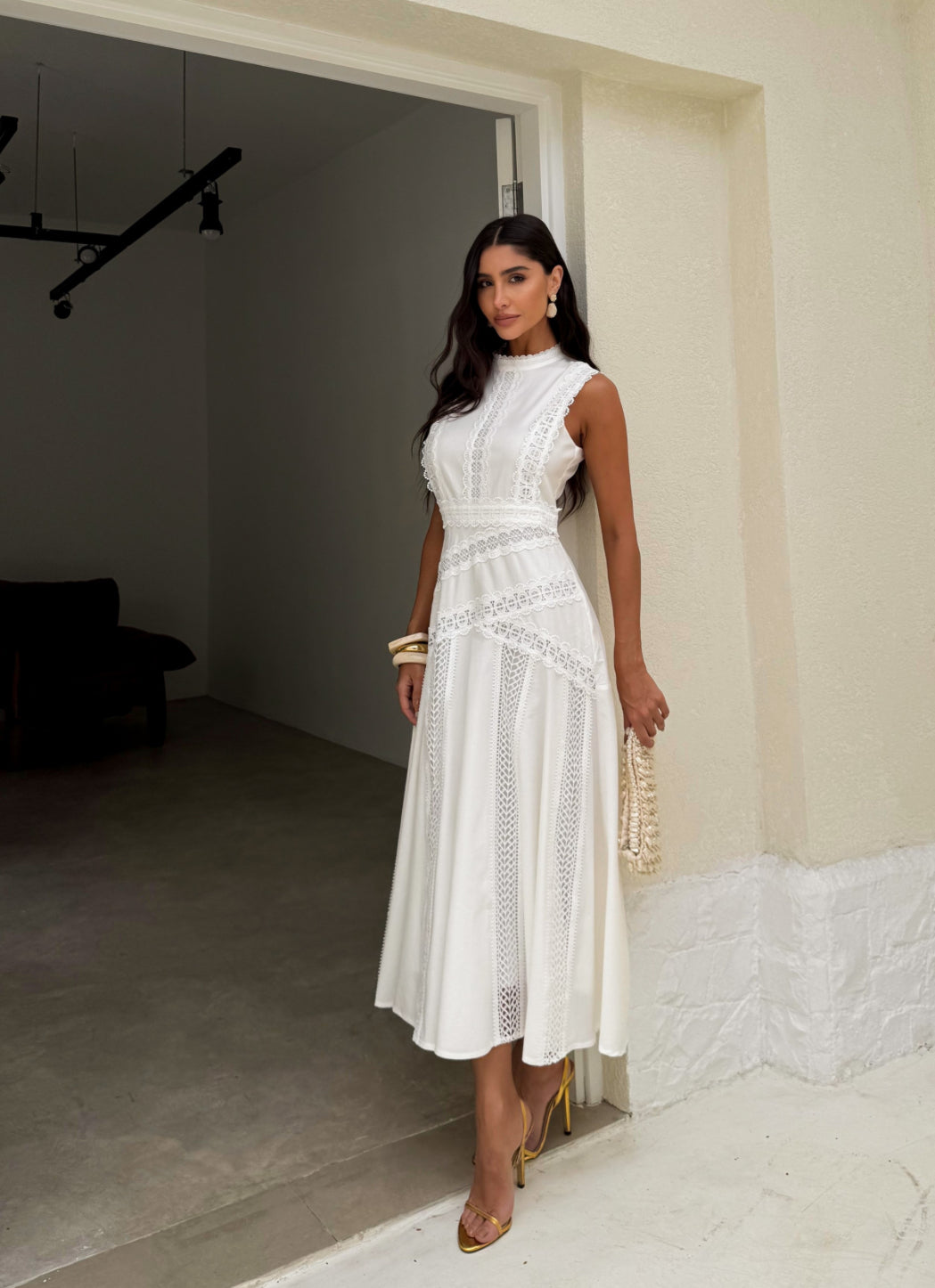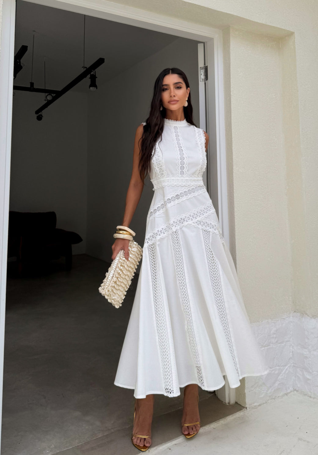 Tricoline dress with various guipure lace appliqués on the bodice, waist, and skirt. It features a back zipper closure and lining.